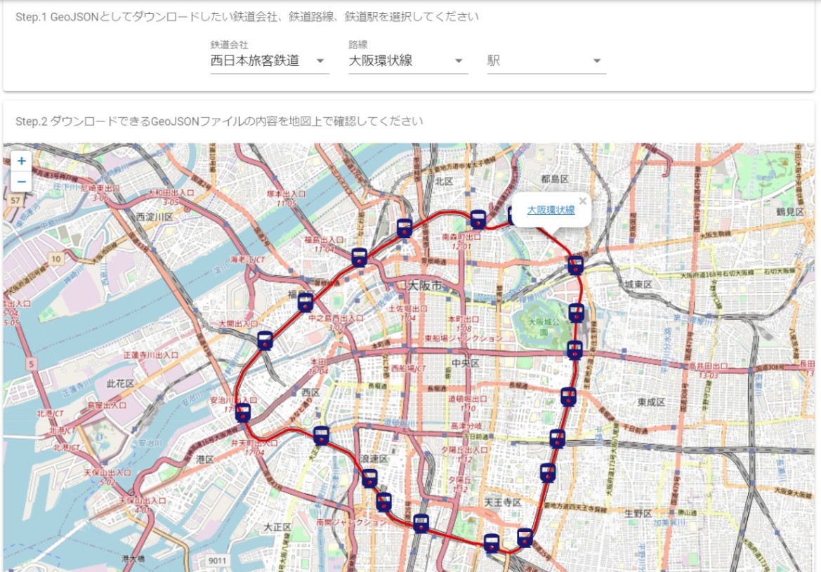 鉄道駅LODから必要なデータが自動的にダウンロード、GeoJSONに変換され、GeoJSONファイルがダウンロードできます。