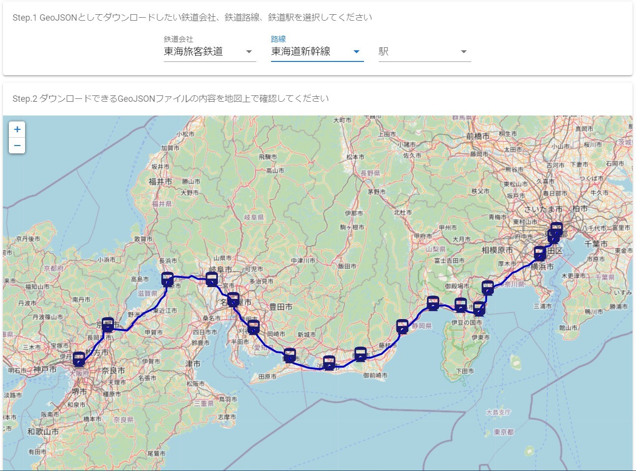 鉄道会社、鉄道路線、または鉄道駅の選択が終わったら、Step.2 の地図でデータを確認しましょう。