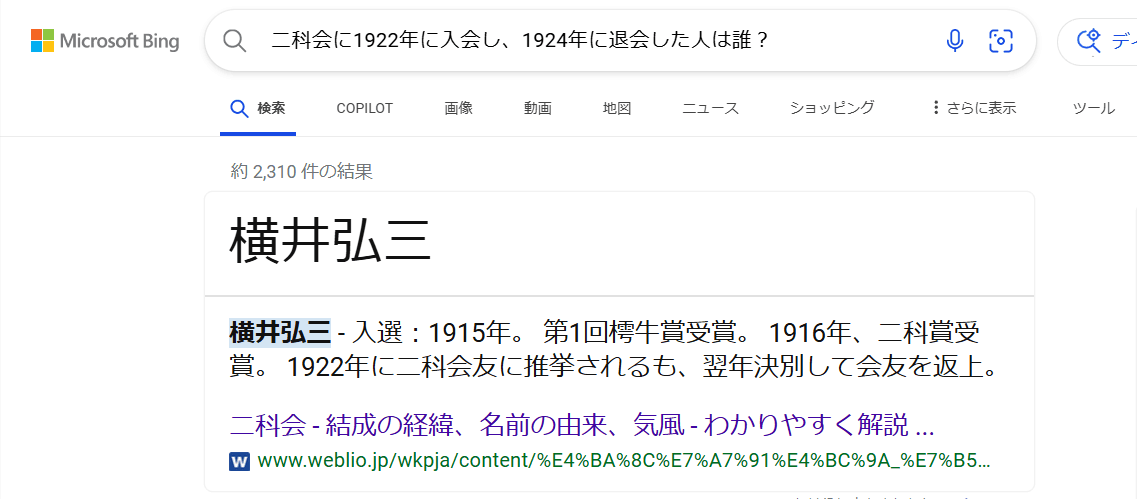半ばヤケクソで「二科会に1922年に入会し、1924年に退会した人は誰?」とbingで検索したところweblioの内容を表示してくれました。