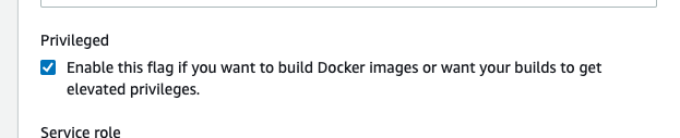 Dockerイメージをビルドする場合は、CodeBuildで使用するイメージの設定を変更する必要があるらしい。