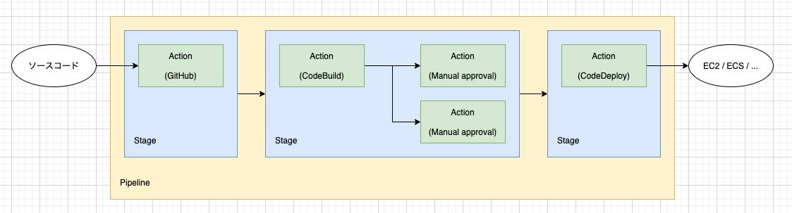 CodePipelineとはアプリをデプロイするために必要なステップを、可視化・自動化できるやつ。