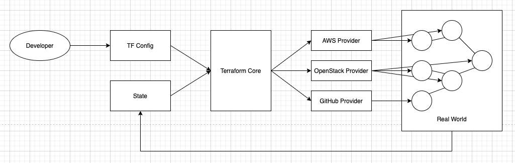 現実世界の情報である State と TFConfig を Terraform のコア機能へと渡し、各Provider を通じで現実世界を更新する。