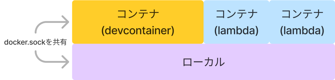 ここで問題が発生します。DevcontainerもDockerのコンテナ上で動いているものなので、Devcontainer上でsamを使用すると、Docker上でDockerを起動することになります。コンテナのイメージ図は以下の通りです。