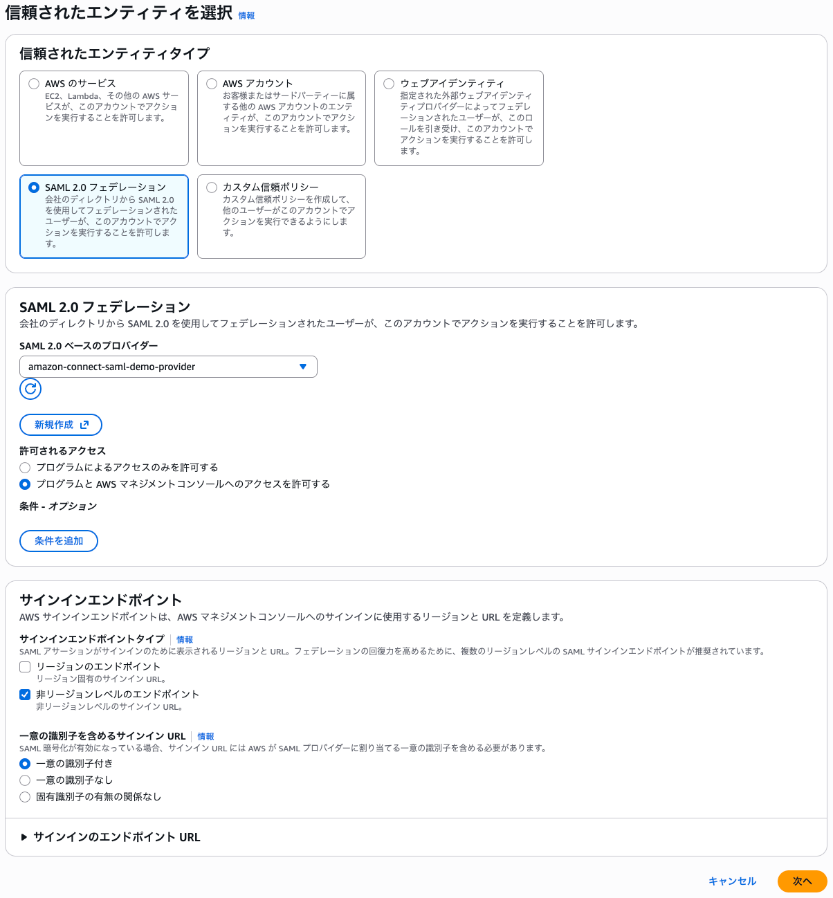 - Amazon Connect フェデレーテッドログイン用許可ポリシー