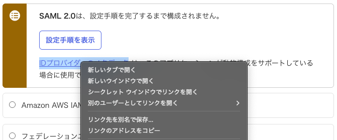 「IDプロバイダーのメタデータ」を右クリックし、リンク先を別名で保存します。