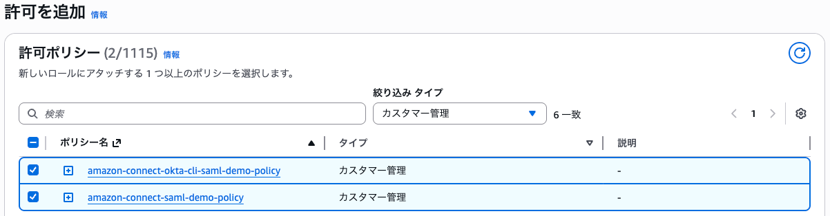 先ほど作成した、「okta 用ロール取得ポリシー」をアタッチします。