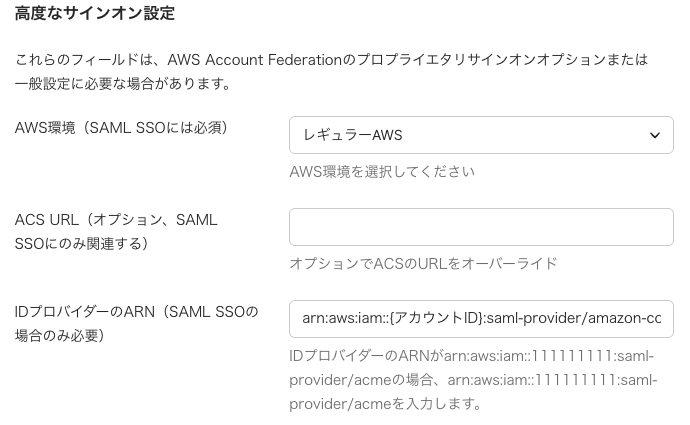 IDプロバイダーの ARN に、先ほど作成した ID プロバイダー の ARN を入力します。
