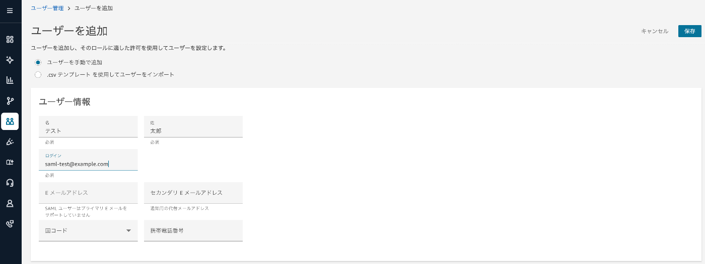 「ログイン」に、okta で割り当てたユーザーID(メールアドレス)を入力して、ユーザーを追加します。
