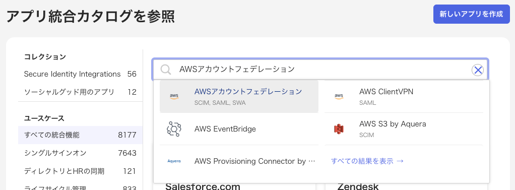 アプリカタログから「AWSアカウントフェデレーション」を検索して、アプリ統合を追加します。