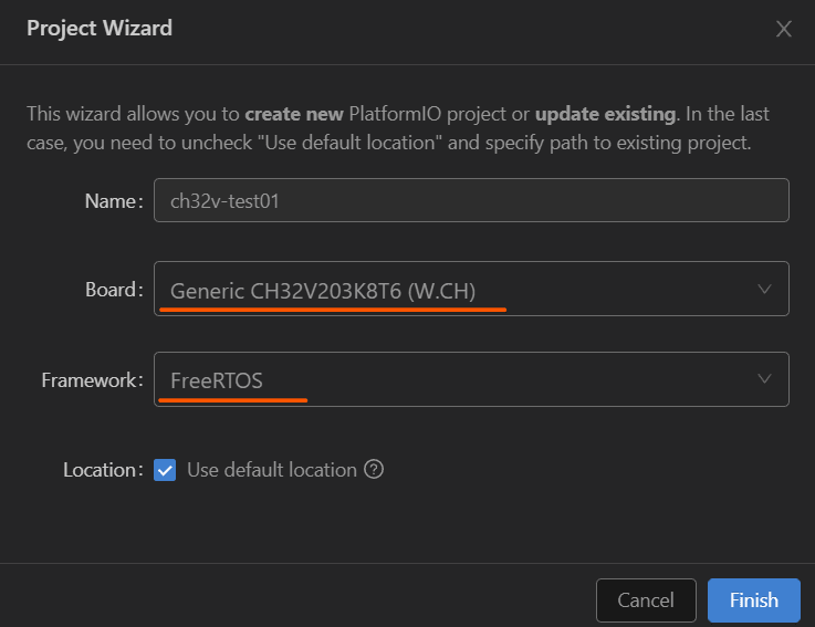 自作基板なので、Generic CH32V203K8T6 (W.CH)、FrameworkにFreeRTOSを選択してプロジェクトを作成。