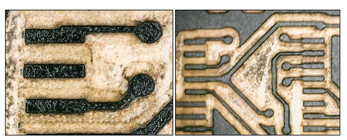 エッチングまではしないです。加工後、クレンザーとかで加工したところの塗膜カスを除去して、USB顕微鏡等で見ます。