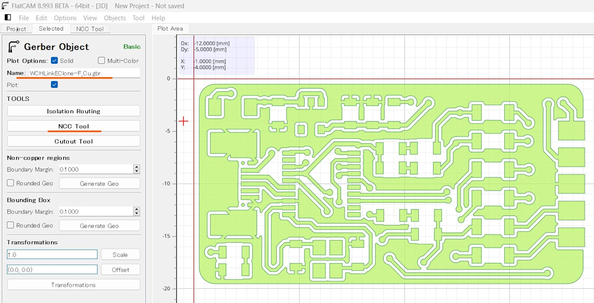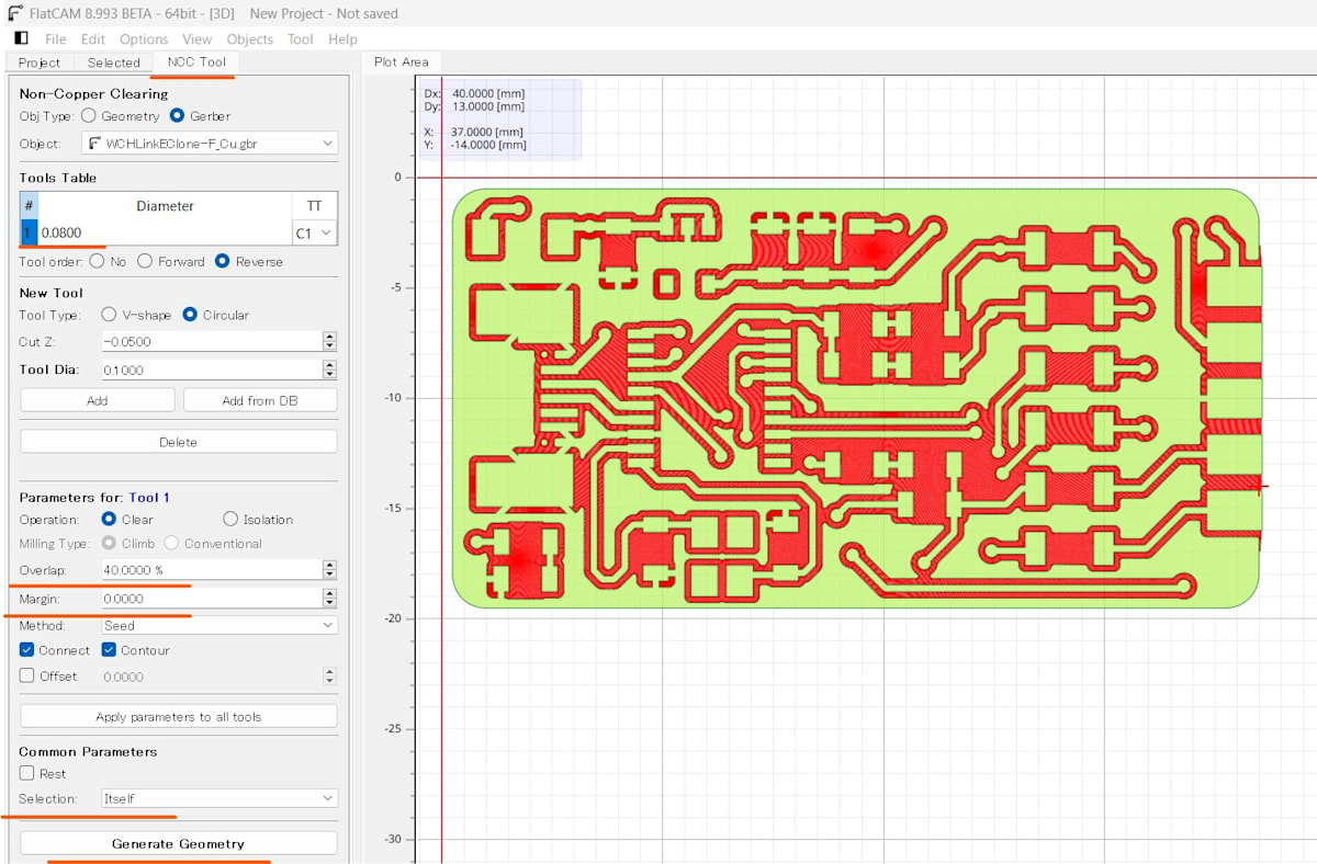 今回は、FlatCAMのNCC Toolで、銅板除去エリア(ガーバーデータの白いところ)を塗りつぶすような加工パスを作成します。