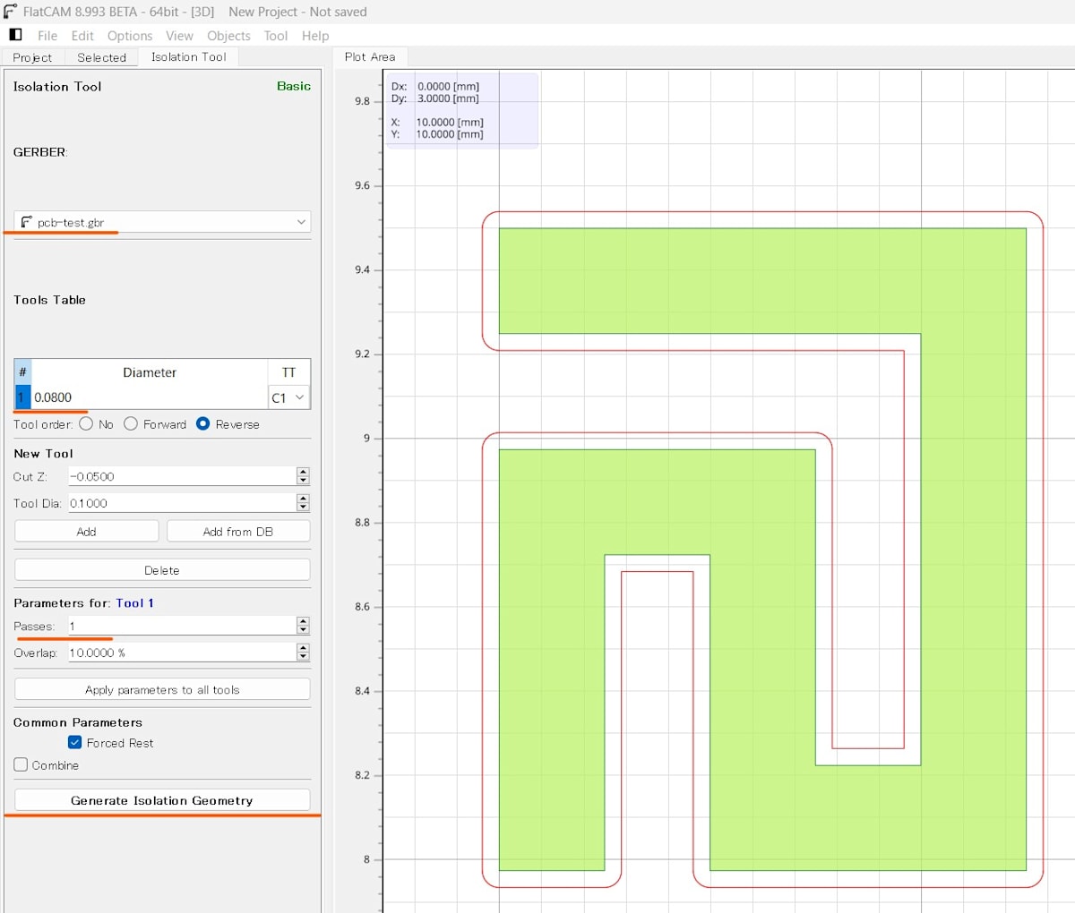 Generate Isolation Geometryをクリックすると、ガーバーデータ(緑色)の外周パスを作成します。このパスをSaveするとDXFファイルで出力できる。