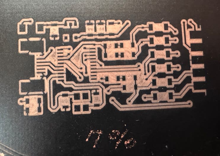 下図のようになりました。ちょっとパターンが細いかな?と思います。もう少しCut Rateを大きくしたほうが良いかも。でした。薄く削り残しがあります。とりあえずエッチングでカバーできるかも踏まえて、手直しは無しとします。