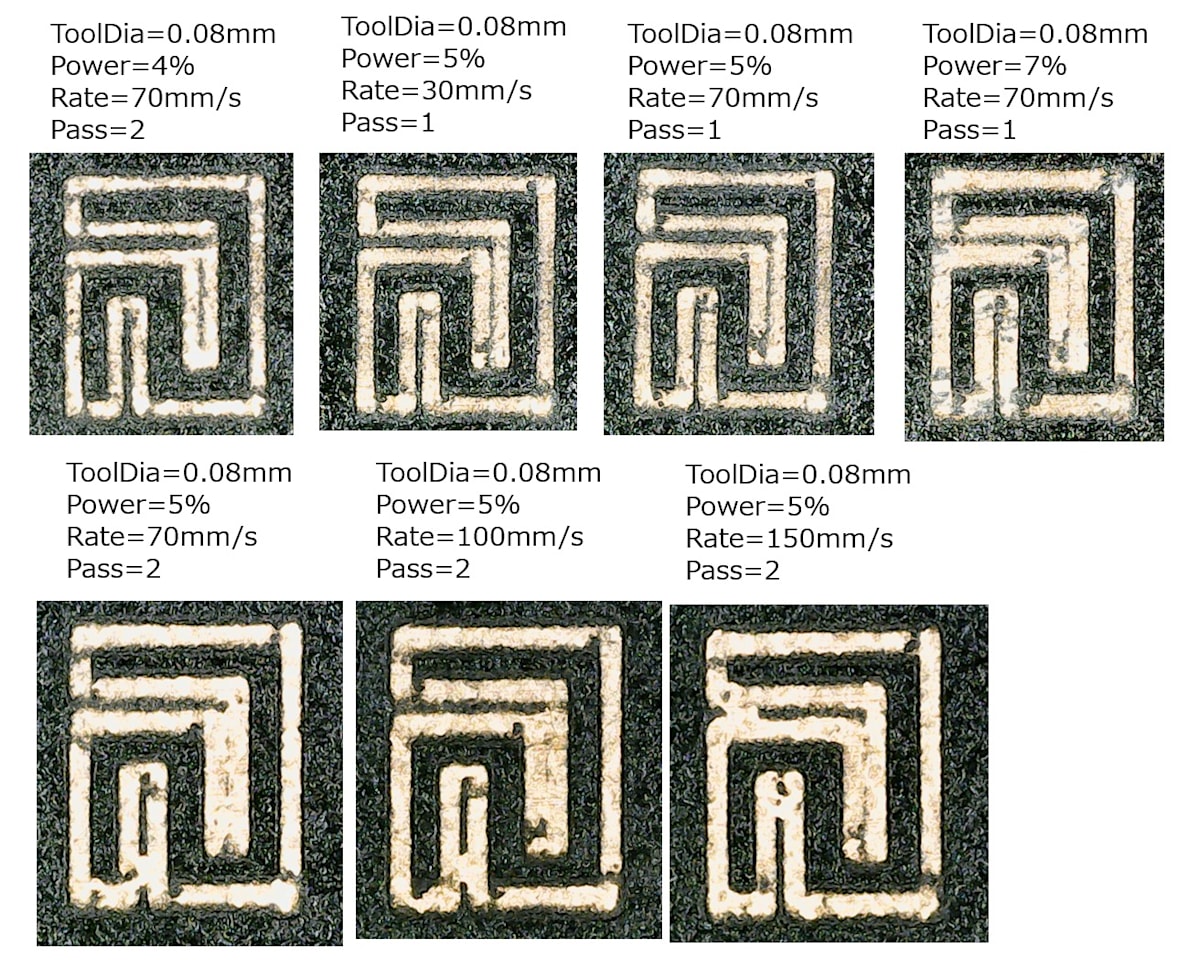 - Powerが大きいと、熱量が大きくて塗膜の融解?が広がって、パターンが細くなる。