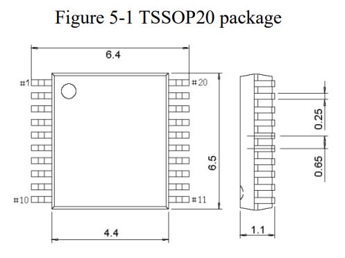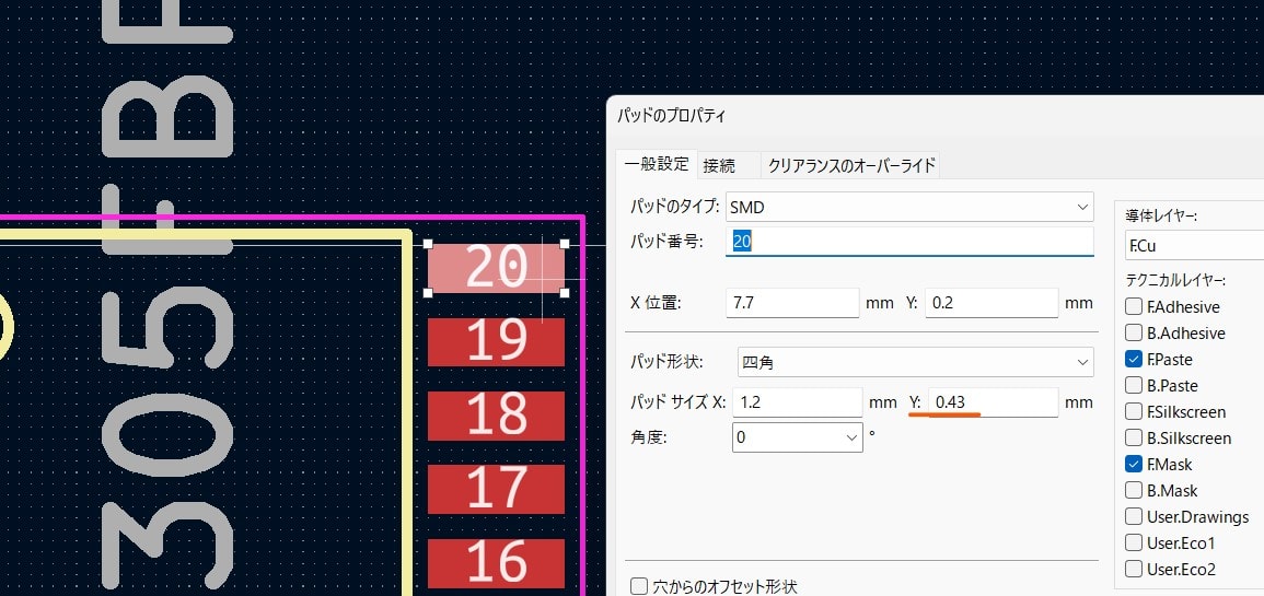 この基板だと、以下のTSSOP20のフットプリントがあり、パターンの太さ0.4mm、ピッチは0.65mmが一番微細なケースになります。