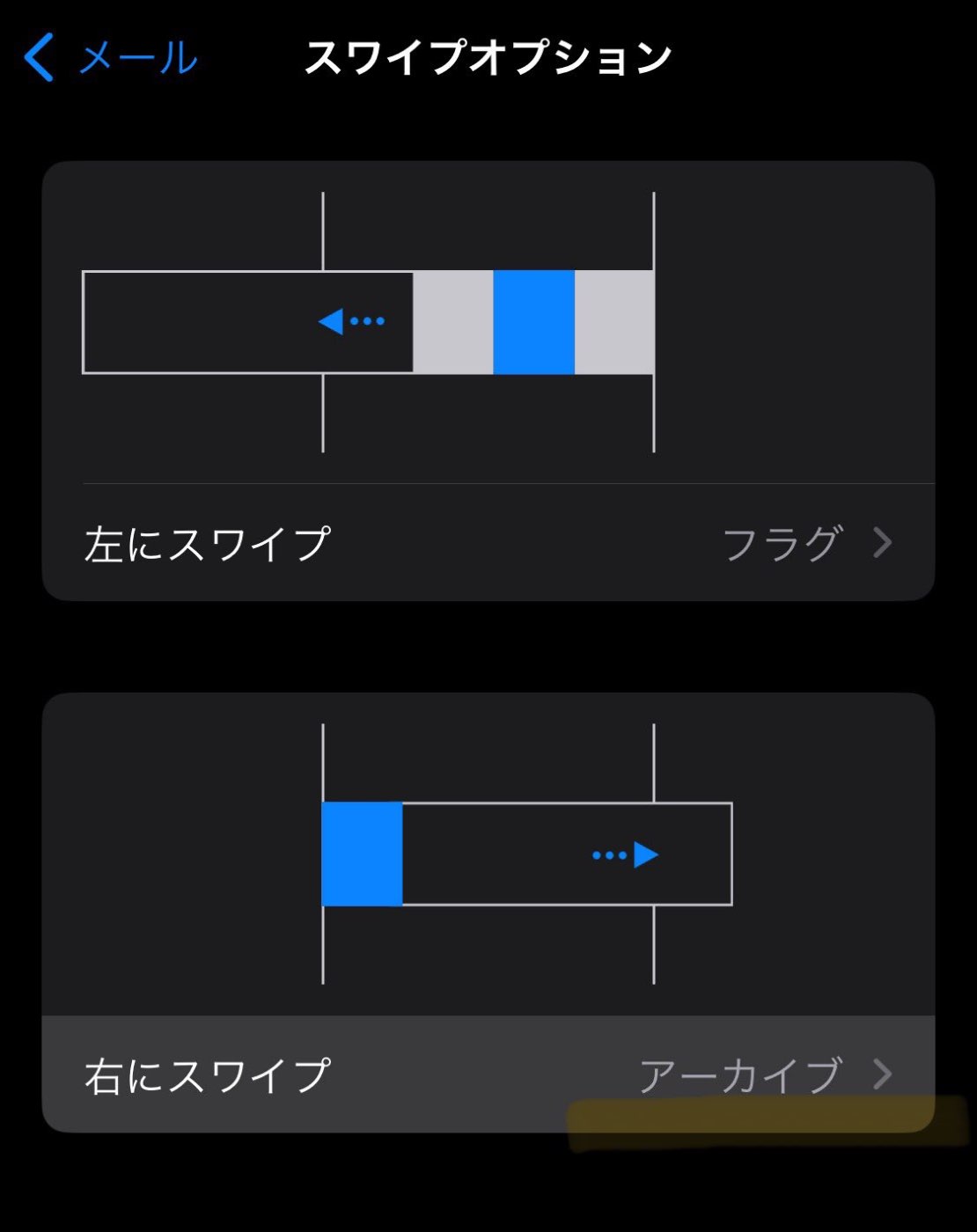 私の場合「右にスワイプ」を「アーカイブ」にしたかったので、スワイプオプションでそのように設定しました。あらかじめ[1]をやっておかないと、ここで「アーカイブ」を選ぶことができず、iCloudアカウントのスワイプオプションと方向があべこべになってしまいます。
