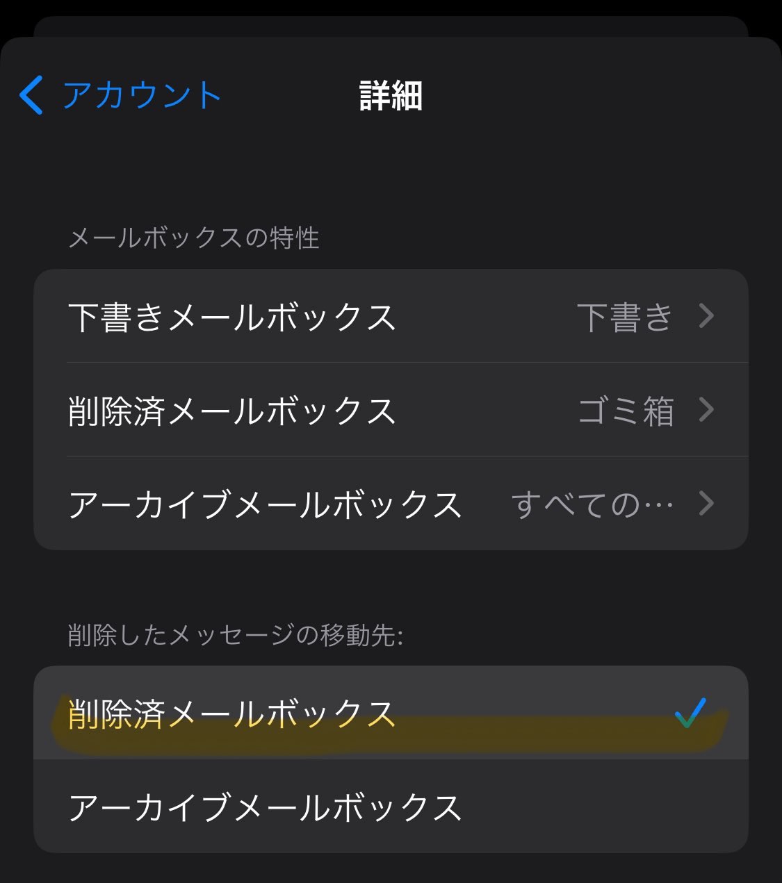 「削除したメッセージの移動先」 の振る舞いを 「削除済メールボックス」 に変更します。