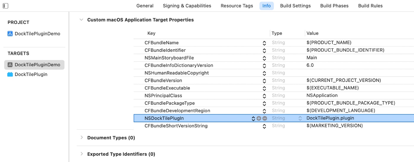 Dock tile plugin側のTargetのInfo.plistにNSPrincipalClassを設定します。今回はDockTilePluginという名前のクラス名にしましたが、命名は任意です。