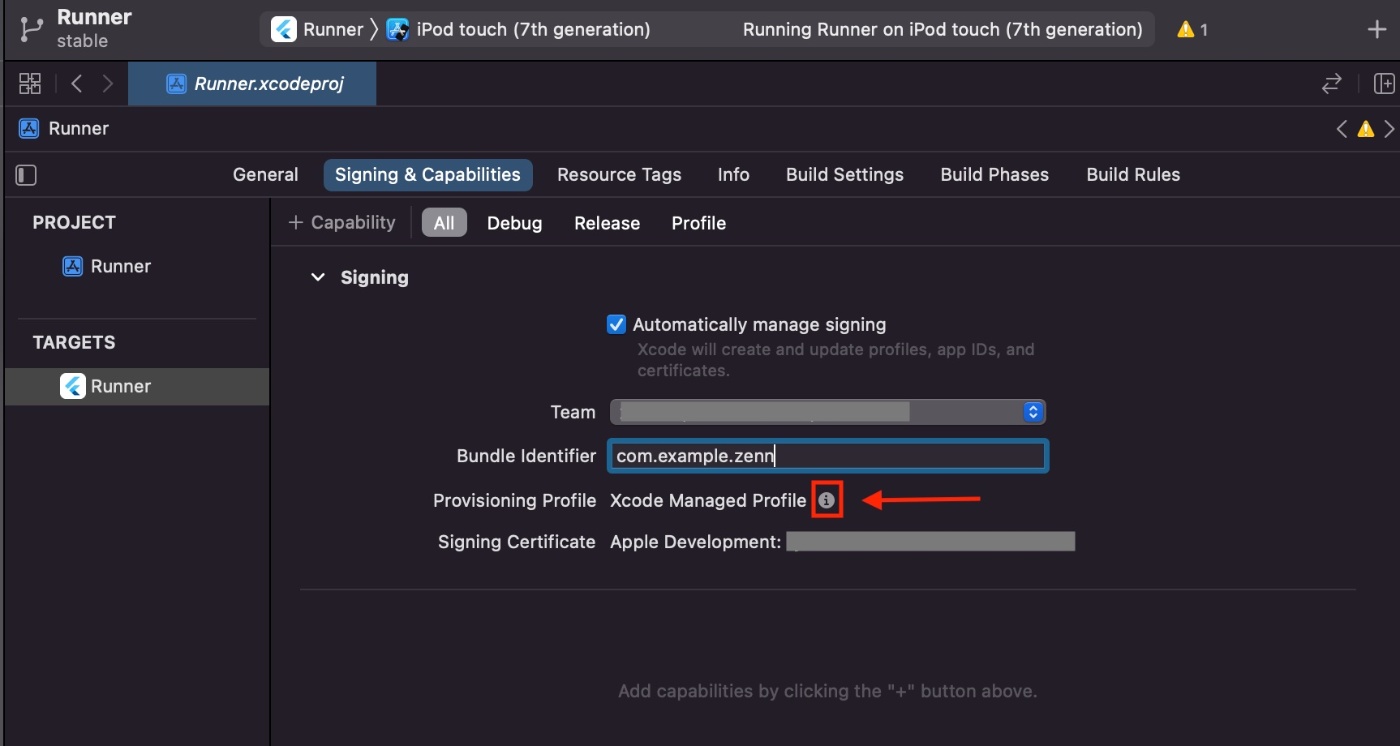 Xcode→TARGETS→Signing & CapabilitiesにあるProvisioning Profileの「i」をクリックします。