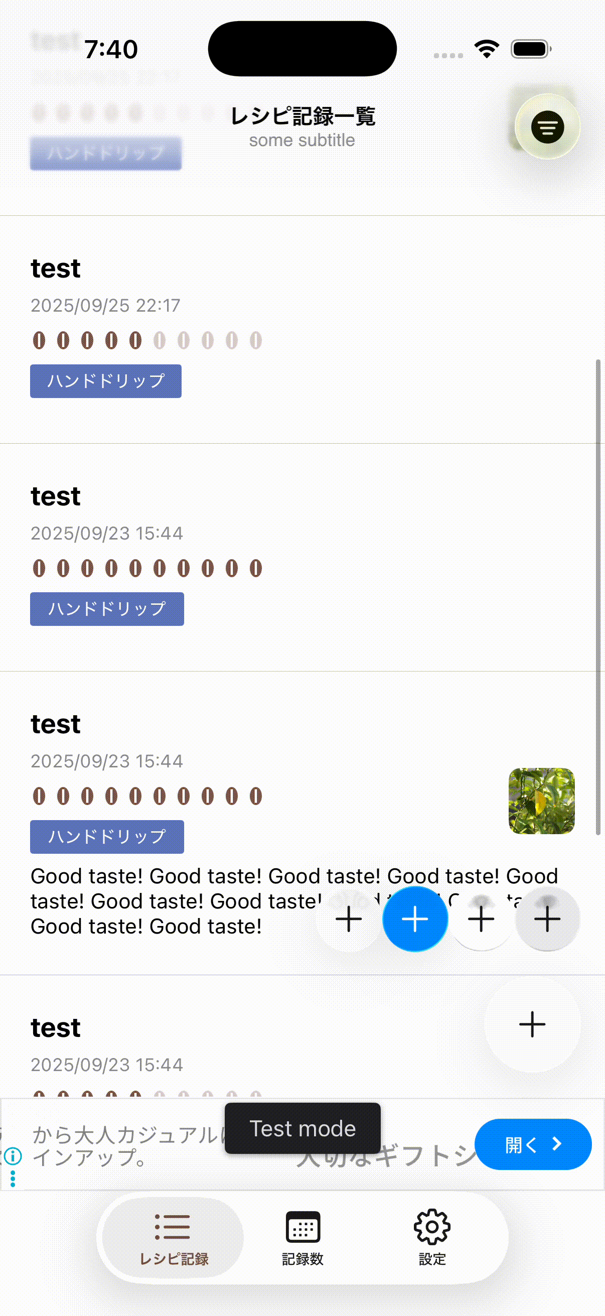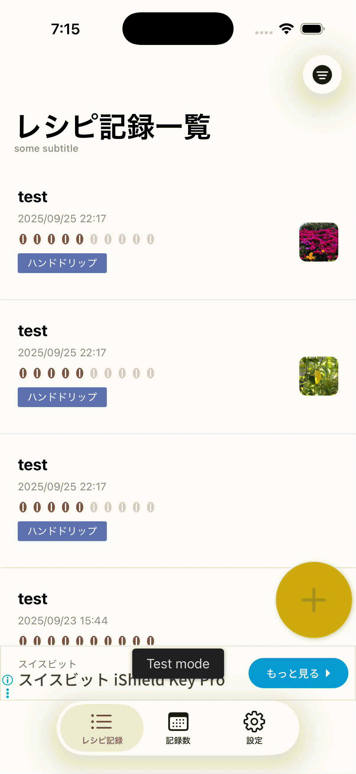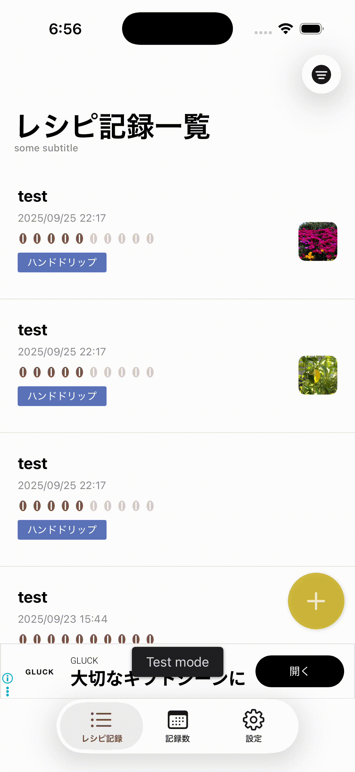 まずはXcode26でビルドしてみて、どんな感じになったか(Liquid Glass)のチェック。個人アプリなので良くも悪くも標準UIで済ませているので、大枠は変な感じはない。