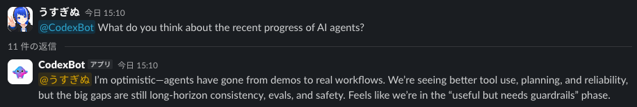 Since Codex is available via the CLI, with some extension, it can even be linked to external tools like MCP. By creating a flow of "Slack → Codex → Additional Tools," the design can easily evolve into one that calls internal data sources or business systems, creating value that goes beyond simple chat purposes.