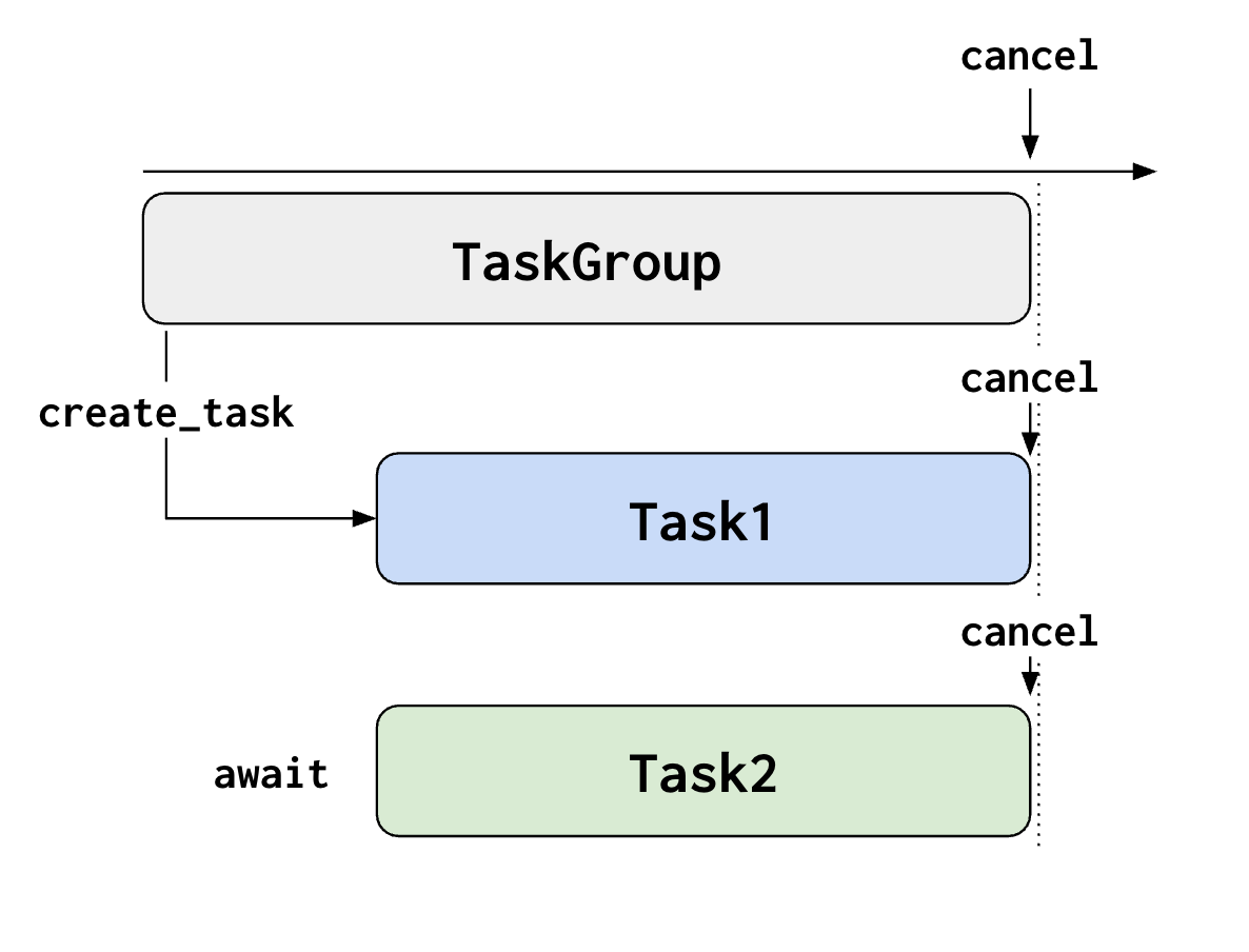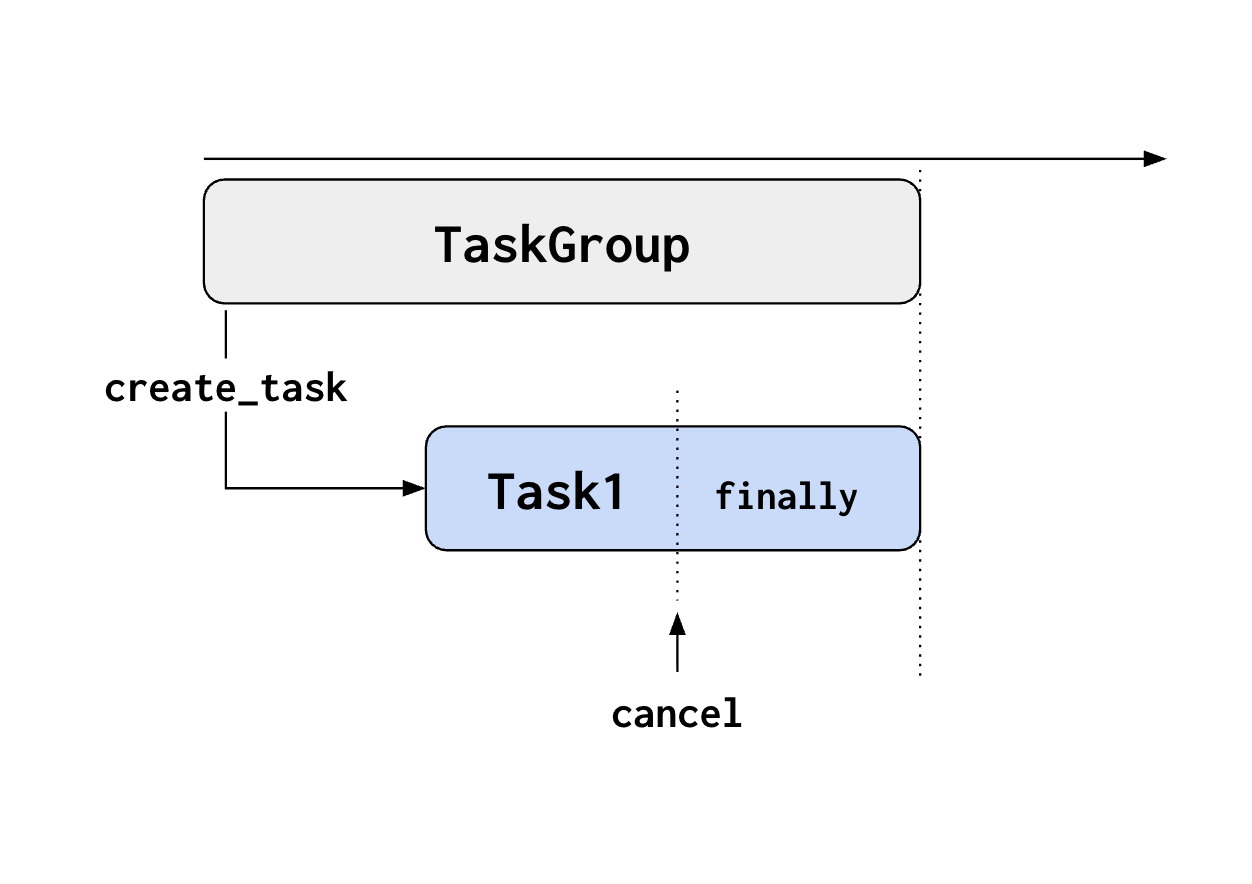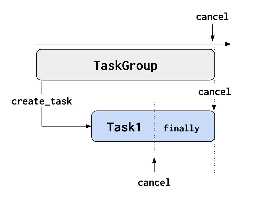 TaskGroup自体がキャンセルされた場合は、実行中のタスクもcontext manager内の処理もキャンセルされます。