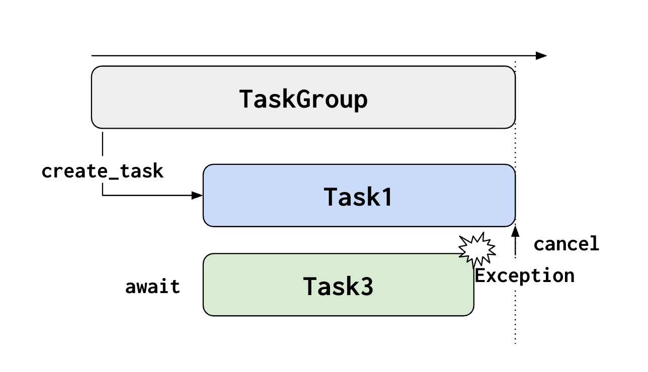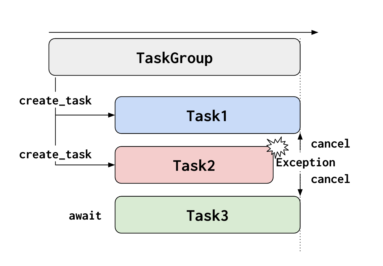 例外発生時は、TaskGroup内の他のタスクやcontext manager内の処理はすべてキャンセルされるようです。