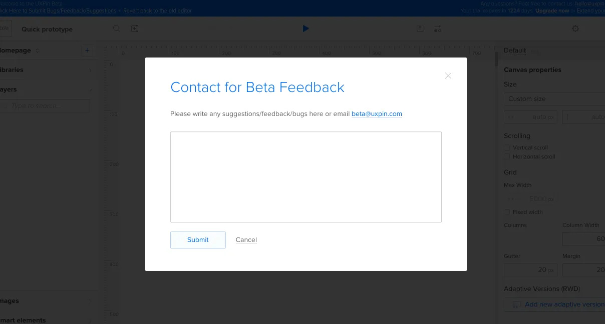 - 顧客からのフィードバックを容易にする - 顧客向けヘルプラインを見つけにくい場所に埋めてはいけません。ユーザーとのコミュニケーションは、できるだけオープンで簡単なものにしたいものです。UXPinをリニューアルした際のベータテストで行ったように、明確ですぐに目に入るコールトゥアクションを作成したり、モーダルでフィードバックを募ったりします。お客様は自分の意見を聞いてもらえることに喜びを感じますが、そのコミュニケーションの糸口を開くのはあなた自身です。UXの観点からも、フィードバックを集約することで、製品を改善するためのヒントが得られます。