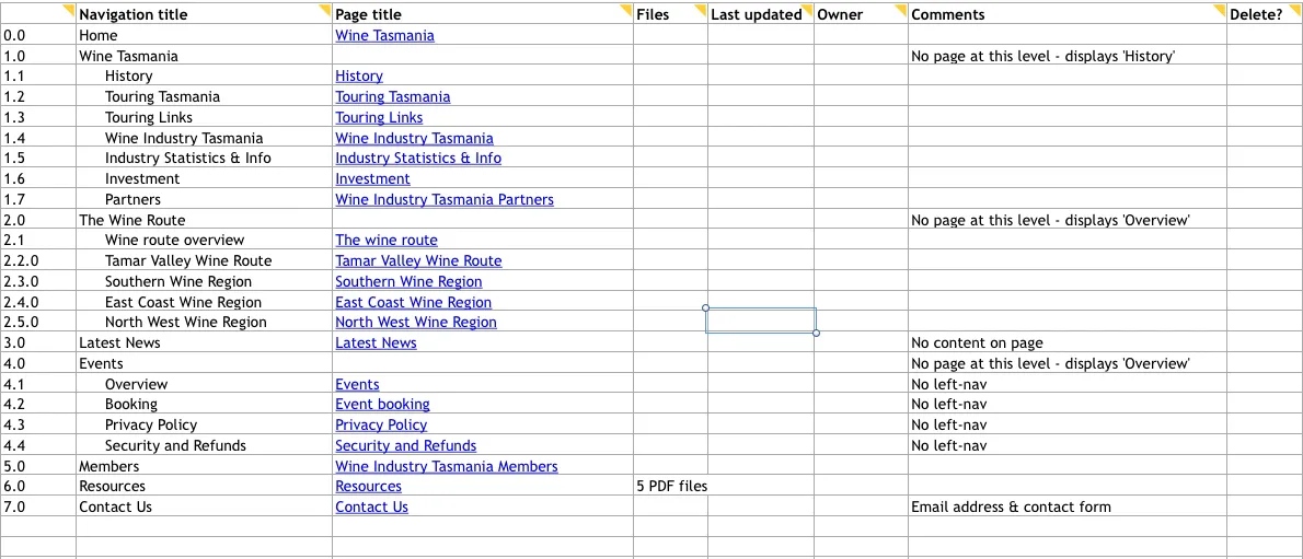 1. コンテンツインベントリ - スプレッドシートまたはそれに相当するドキュメントには、含めるべきすべての要素が含まれています。