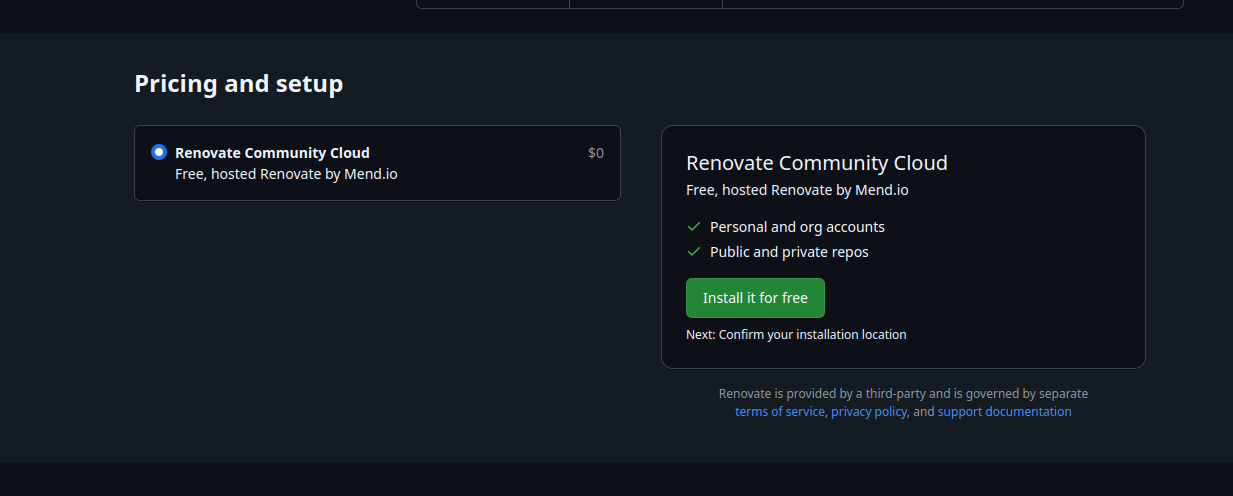https://github.com/marketplace/renovate#marketplace-plans-container にアクセスして「install it free」を押す