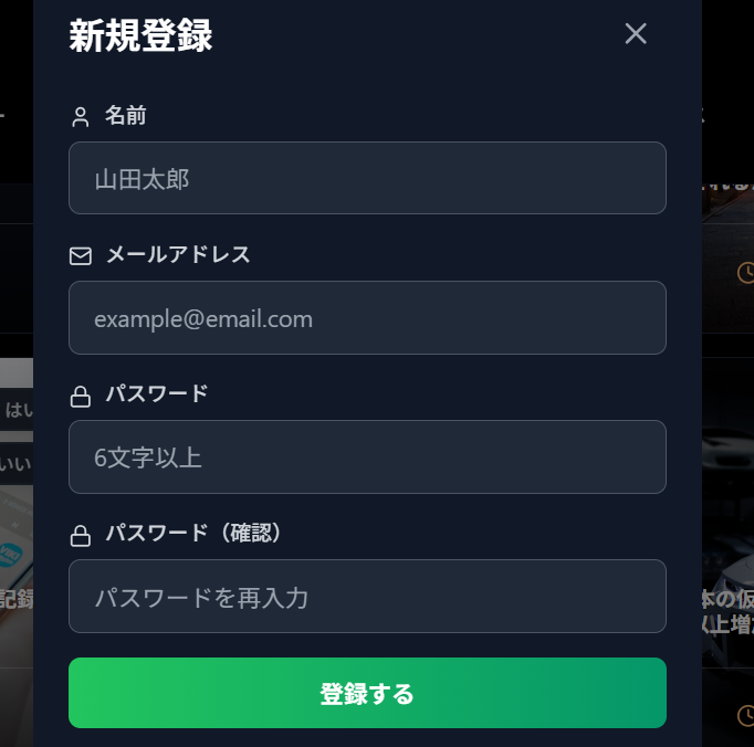 - 新規登録(メールアドレス+パスワード)