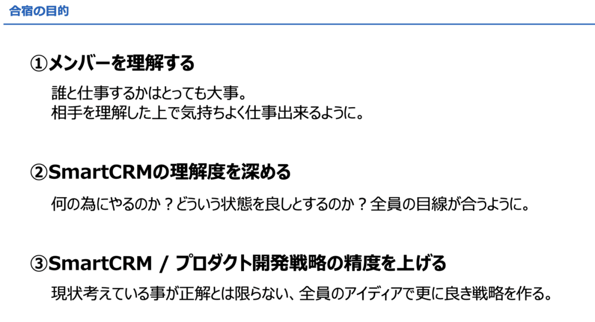 合宿の目的をさらに詳細にすると以下となります。(SmartCRMというのがSaaSのサービス名となります)