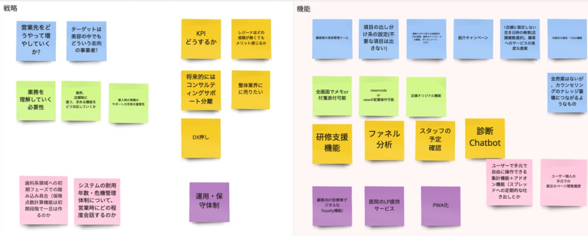 その後にmiroを使って開発メンバーを中心に、戦略や今後追加したい機能のディスカッションを以下のように行いました。