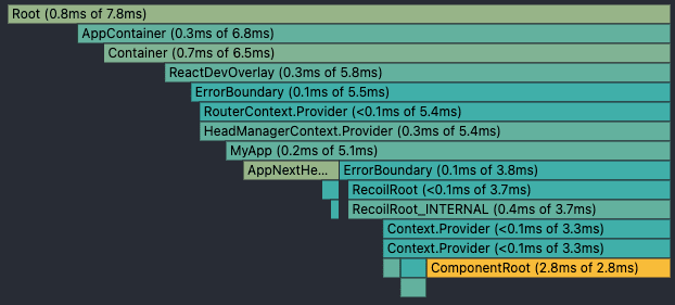 (例 Rootのレンダリングにかかる合計時間は7.8ms。ただし、Root自体のレンダリングにかかる時間は0.8msであり、残り7.0msは子コンポーネントのレンダリングにかかった時間。) -
