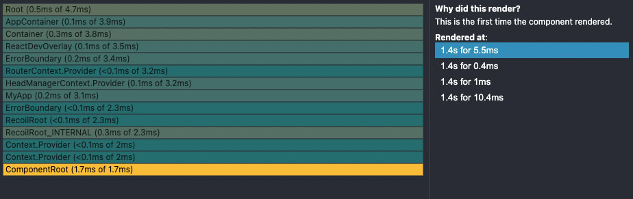 (例:ComponentRootのレンダリングはプロファイリング開始から1.4s後に5.5ms間レンダリングが行われた)