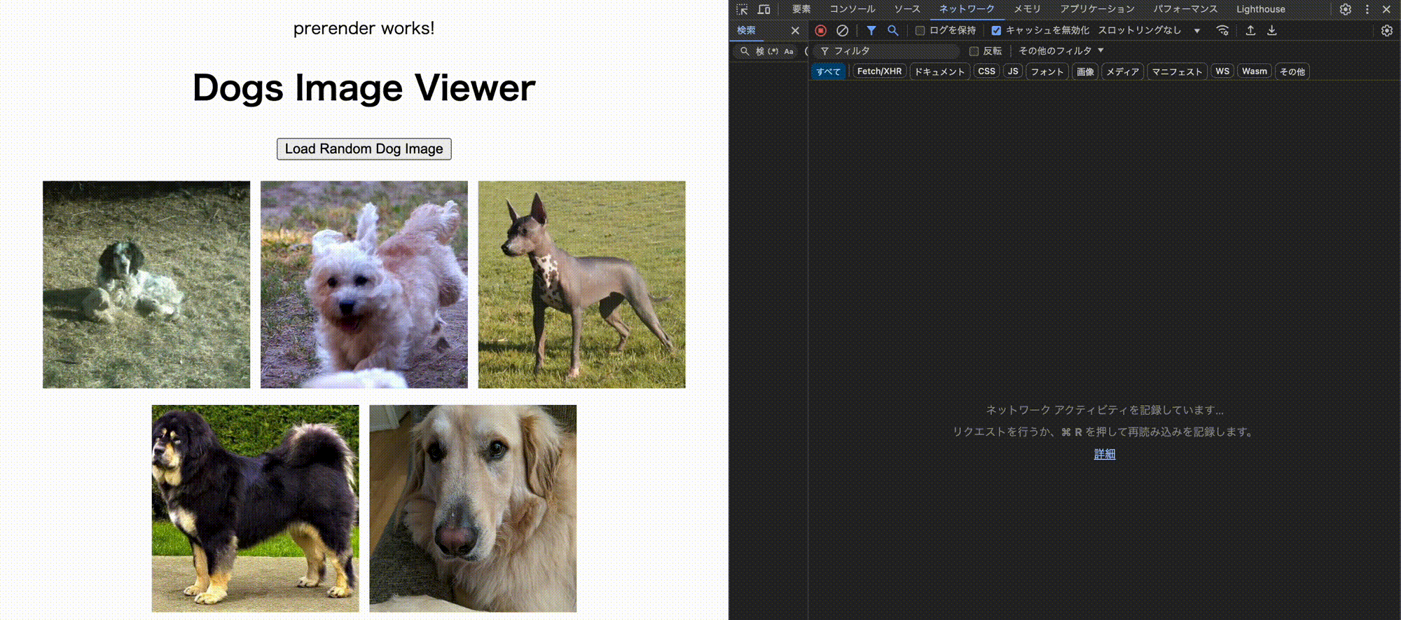このアプリケーションは、HttpClientを利用してHTTP通信を行いランダムな犬の画像のURLを取得したものを表示する1つのコンポーネントを、server, client, prerenderというパスのページコンポーネント内で同様に表示します。