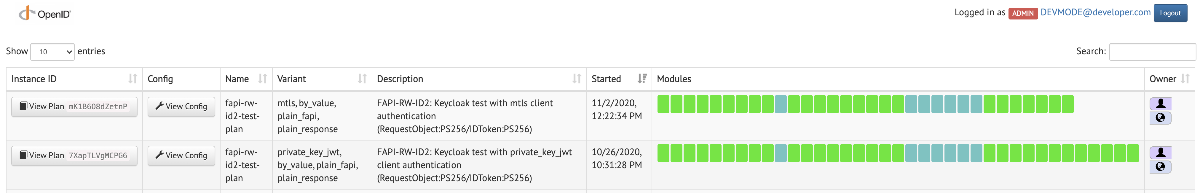 KeycloakのFAPI対応のテストでリソースサーバをNginxに移行[4]するというプルリクエストで紹介したNginxの設定とLuaスクリプトを利用しているのですが、ローカルでConformance suiteを実行し、全件パスすることを確認しています。以下、Conformance suiteの実行結果のキャプチャです。