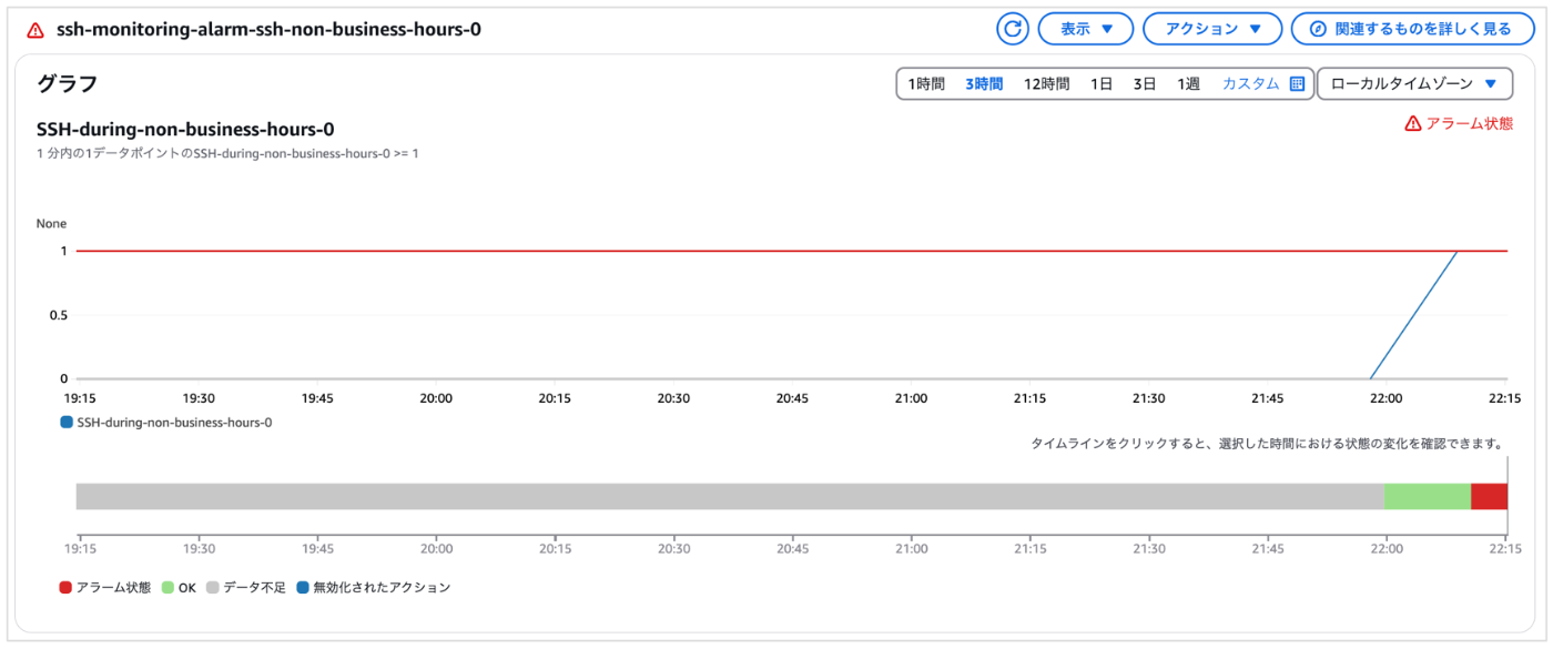 こちらはCloudWatch Alarmの閾値を1と設定しているため、SSH-during-non-working-hours-0のメトリクス値が1を超えた段階で、即座にアラーム状態に遷移していることを確認できます。以上で、「時間外のSSH接続検知」の動作確認も完了です!