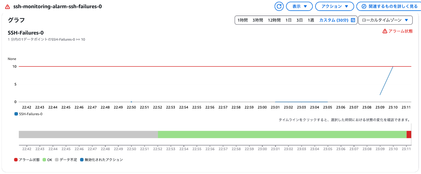 そして、CloudWatch Alarmを見てみると、SSH-Failures-0のメトリクス値が10を超えたタイミングでアラーム状態に遷移しました!これにて「SSHパスワード失敗認証検知」の動作確認は完了です!