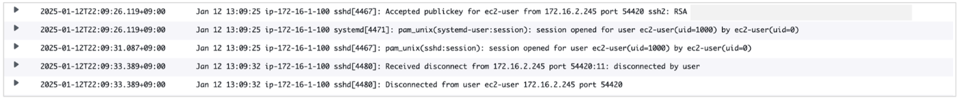 こちらもterraform applyコマンドを実行した後に、21:00-7:00(JST)の間に公開鍵認証によりSSH接続してみます。/var/log/secureにAccepted publickey from ec2-userというログが確認できるはずです。