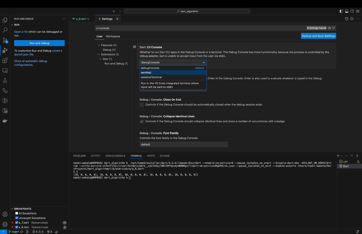 🏄Dartで標準入力を受け取りbreakpointを当ててDebugする方法2023/12/29に公開Darttech はじめに 今回はDartプロジェクトで標準入力を受け取り、breakpointを当ててDebugできるようにしたかったのでその方法を備忘録として残します。 方法 「Code」>「Preference」>「Settings」を選択 「ci console」と検索してterminalを選択 これで設定完了! あとはmain関数の上のDebugをクリックするとプログラムが動いてbreakpointが使えるようになります! Discussion