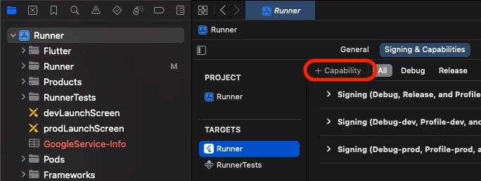 - Signing & Capabilitiesタブを開き、「+ Capability」から「Sign in with Apple」を追加します。