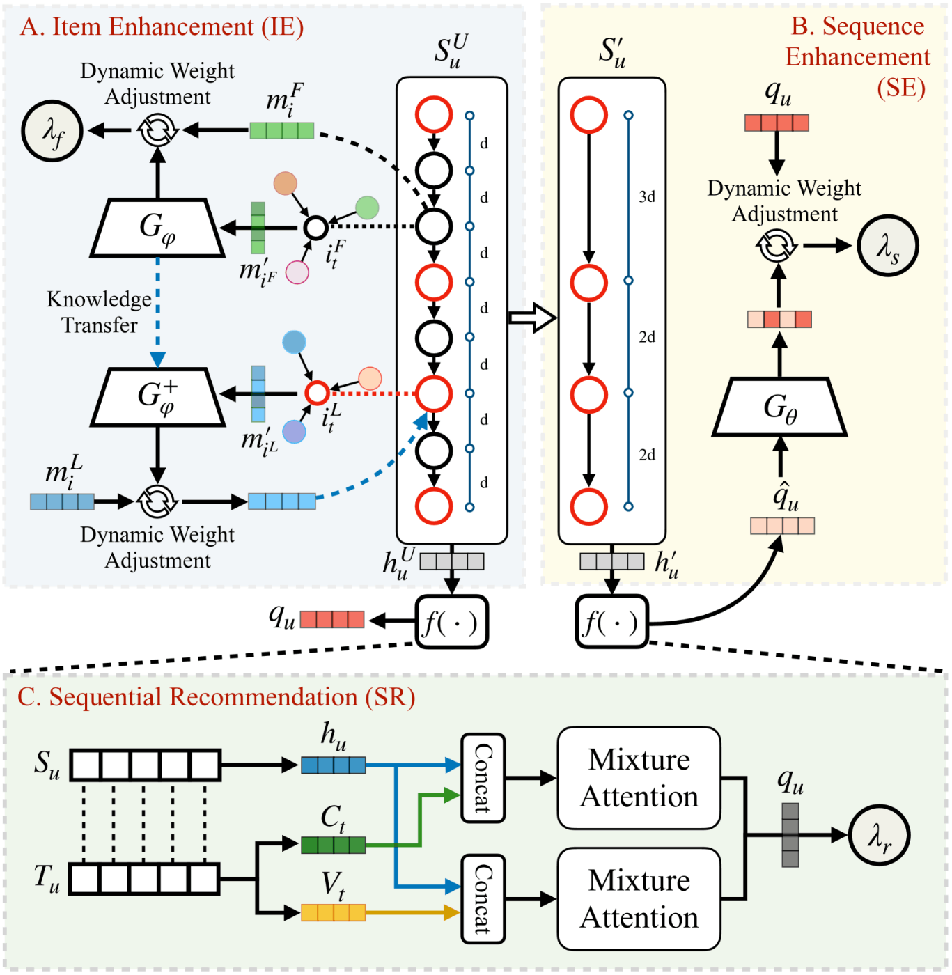 提案手法は3つの要素で構成されていて、A.Item Enhancement(IE), B.Sequence Enhancement(SE), C.Sequential Recommendation(SR)としてそれぞれ整理していきます。
