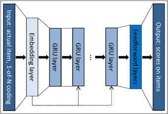 このモデルを含めて初期の時系列推薦モデルは、入力シーケンスから出力の埋め込み表現を獲得し、全結合層を全商品のスコアを計算するため、商品数が多くなってくる(〜1M)と全結合層の重みと計算コストが膨大になるという問題がありました。先ほど例に出したGRU4Recも同様で、論文中にある以下のアーキテクチャ図を見るとよりわかりやすいと思います
