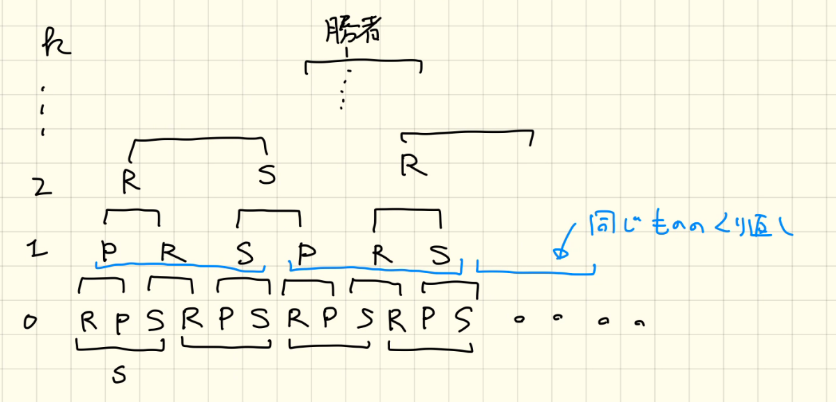 が奇数だと実装しにくいので、n が奇数のときはn としてss を偶数として考えるn - じゃんけんの勝敗はネストされた