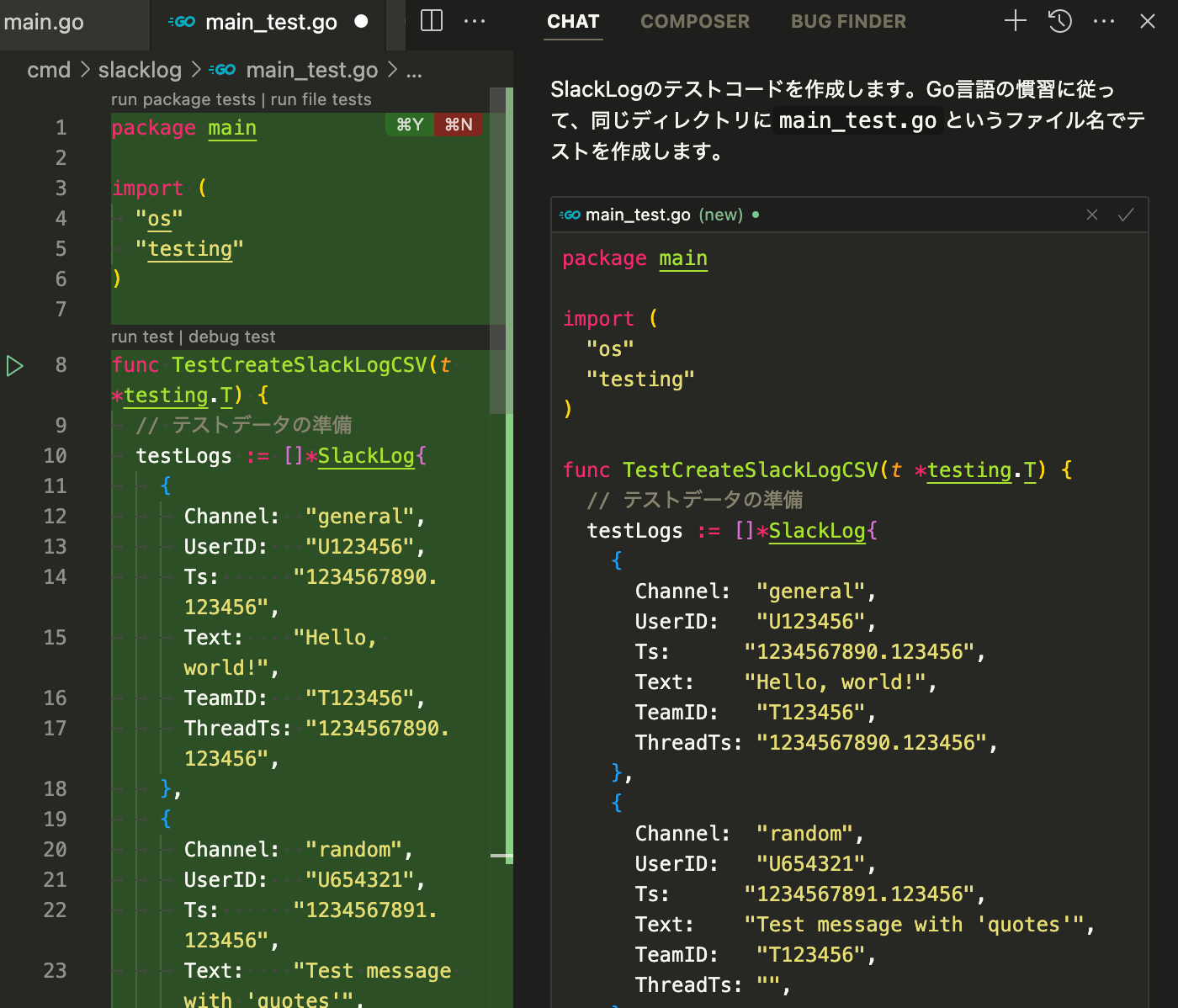 Cursorであれば、他のテストコードの様式に合わせて自動でテストを書いてくれます