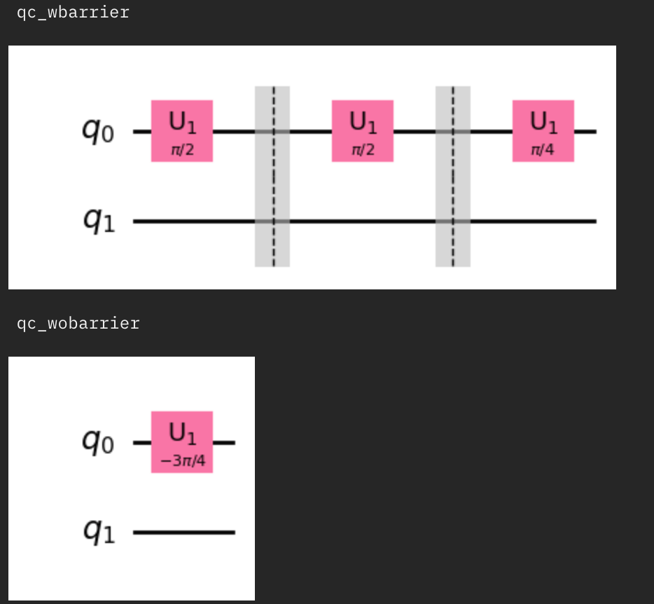 それぞれの操作毎にbarrierを挟むと,それぞれの操作で区切られる。一方で,barrierを入れないとS行列2回による