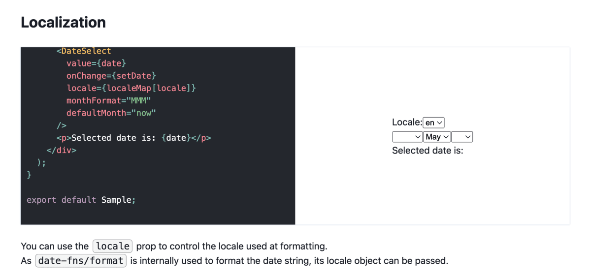 実際のページは以下のようになった。サンプルコードがセットされたコードエディタと、ライブラリのReactコンポーネントのレンダリング結果が横に並んだ形。これが他の要素と共にwebページに埋め込まれている。