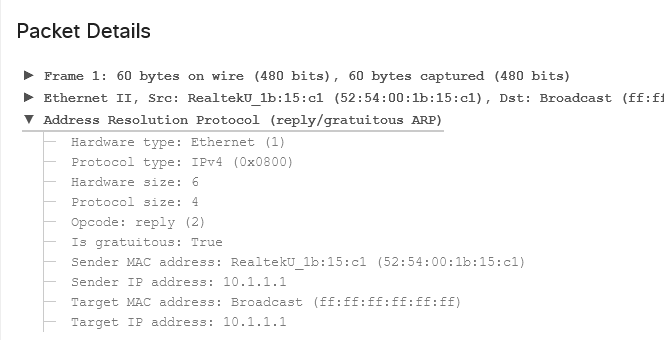 *Mar 6 18:54:19.587: IP ARP: rcvd req src 10.1.1.1 5254.001b.15c1, dst 10.1.1.2 GigabitEthernet1 tableid 0